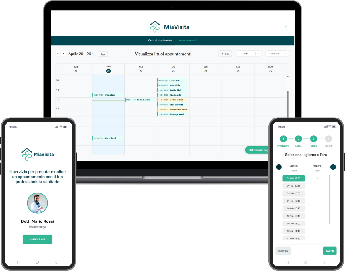MiaVisita è pensata per professionisti sanitari che lavorano in libera professione presso studi privati individuali e vogliono automatizzare la gestione degli appuntamenti, riducendo il carico organizzativo e i costi fissi di segreteria.