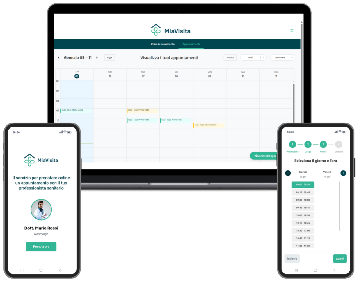 Prendi il controllo della tua agenda con MiaVisita. Offri ai tuoi pazienti un sistema di prenotazione professionale sui tuoi canali, riducendo le telefonate e i mancati appuntamenti.